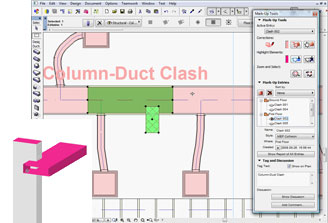 这个功能提供了一种独一无二的,完全自动化的程序来辨别和标示建筑设计与MEP管网之间的冲突。建筑结构与MEP系统的冲突检测确保了为建筑师与工程师团队的流畅协作提供快速而精确的反馈。在平面图和3D视图中,MEP冲突检测可以识别冲突的精确位置。所有的冲突项目都被自动添加到ArchiCAD标记面板,以方便识别。设计师可以一个个的快速评估这些项目,通过单击来判别它们在设计中的位置。扩展的设计团队成员可以使用ArchiCAD标记工具来进行讨论并评估若干可供选择的解决方案。