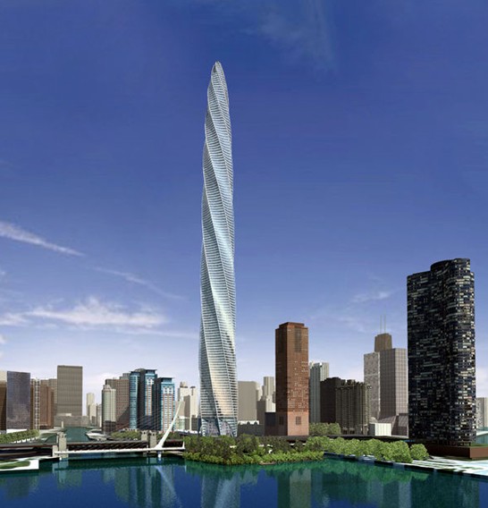 芝加哥螺旋塔是一座正在建造的纯住宅摩天大厦,位于美国芝加哥市中心,计划高度为610米,由偶像派建筑师圣地亚哥·卡拉特拉瓦(Santiago Calatrava)设计,建设地点位于芝加哥北湖滨路400号,俯瞰芝加哥河与密歇根湖交汇处。“芝加哥螺旋塔”共有150层,高610米,原定于2012年完工,不过目前已经处于停工状态。建成之后,它将是北美最高的建筑物。此整座大厦呈螺旋上升形状,每层楼旋转2度,并且随着大厦楼层的升高,楼层的宽度则随高度递减,整座大厦外形如同一把 锥形的长剑。设计师表示,建设这栋楼的灵感来自于在一个美洲土著的焰火堆里看到的盘旋上升的烟雾。